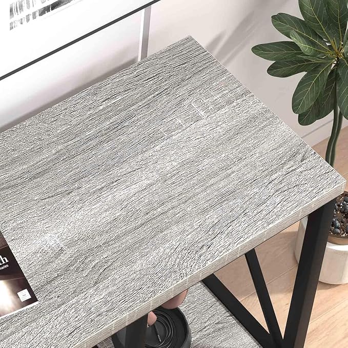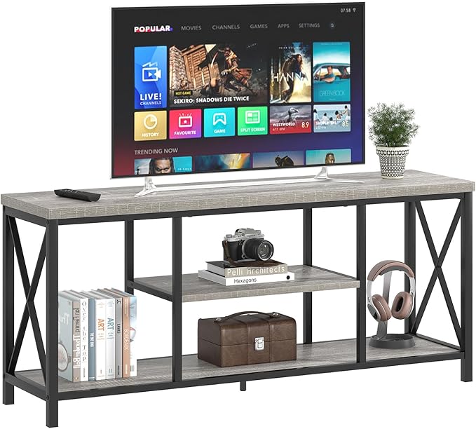 - Light Grey TV Stand, 55-Inch Media Console: This TV stand features a light gray wood grain surface with a black metal frame, blending rustic modern styles. Ideal as media console for living rooms, bedrooms, or entertainment rooms, enhancing any home decor
