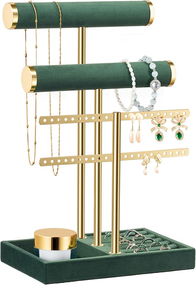 3 Tier Bracelet Holder Display - Detachable T Bar Dark Green Velvet Bracelet Holder, Jewelry Holder Organizer for Bracelet, Necklace, Earrings, Rings