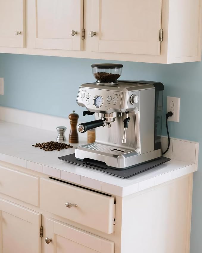- Easy to Use: No assembly required, our coffee maker slider are ready to use right out of the box! Make it easy to quickly and quietly slide your kitchen appliances, allowing you to smoothly pull them out from under the cabinets, easy to add water and coffee beans, while protecting cabinets from steam damage. Keep your kitchen countertops clean and organized, perfect for small Spaces.