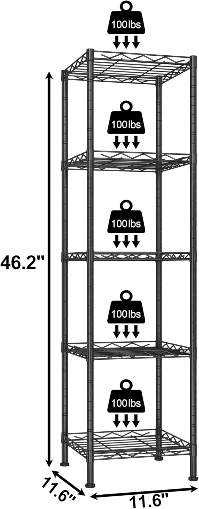 - 【Space-Saving Dimensions】Compact 11.4"W x 11.4"D x 46"H, the 5-tier storage metal rack is perfect for narrow spaces, kitchen corners or cramped pantry, making the most of the room's storage organization.
