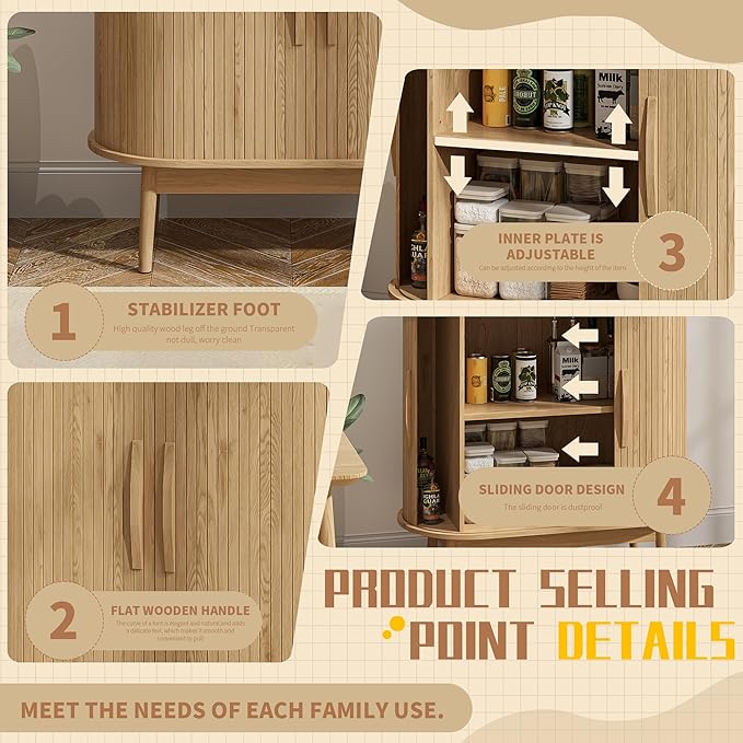 - Mid Century Modern Style: This small accent cabinet embrace the mid century modern style with minimalist aesthetics. Our sideboard buffet cabinet with storage also designed with curved edges and slatted sliding door to effortless gliding