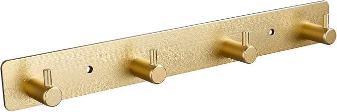 Gold 4 Wall Hooks, Brushed Gold Bathroom Hook Rail, Self Adhesive Key Hook Rack Hanger Towel Robe Stick Hooks for Toilet Entryway Hallway Kitchen Wall Mounted