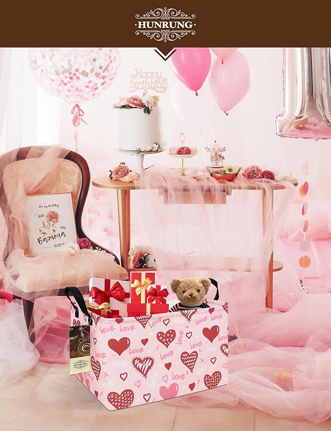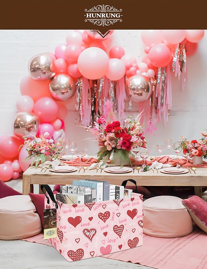HUNRUNG Rectangle Storage Basket Cute Canvas Organizer Bin for Pet/Children Toys, Books, Clothes Perfect for Rooms/Playroom(REC-Pink Love Heart)