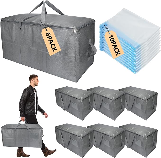 Extra Large Storage Bags Set Heavy Duty Moving Totes with Handles, Waterproof Dual-Way Carrying Design Space-Saving Packing Supplies, Includes 10 Vacuum Seal Bags
