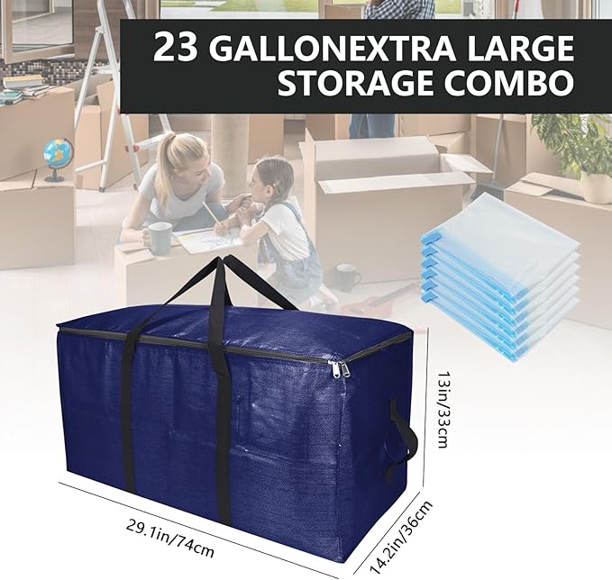 Extra Large Storage Bags Set Heavy Duty Moving Totes Strong Handles & Zippers, Waterproof Dual-Way Carrying Design For Dorm Room Essentials, (Blue, 14 Park-4 Moving bag & 10 Vacuum Seal Bags)