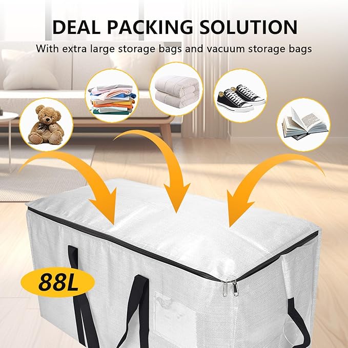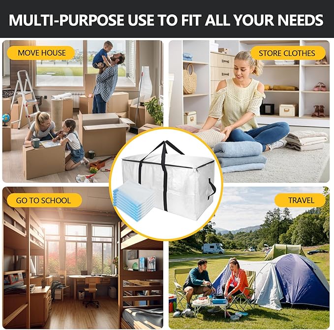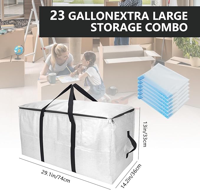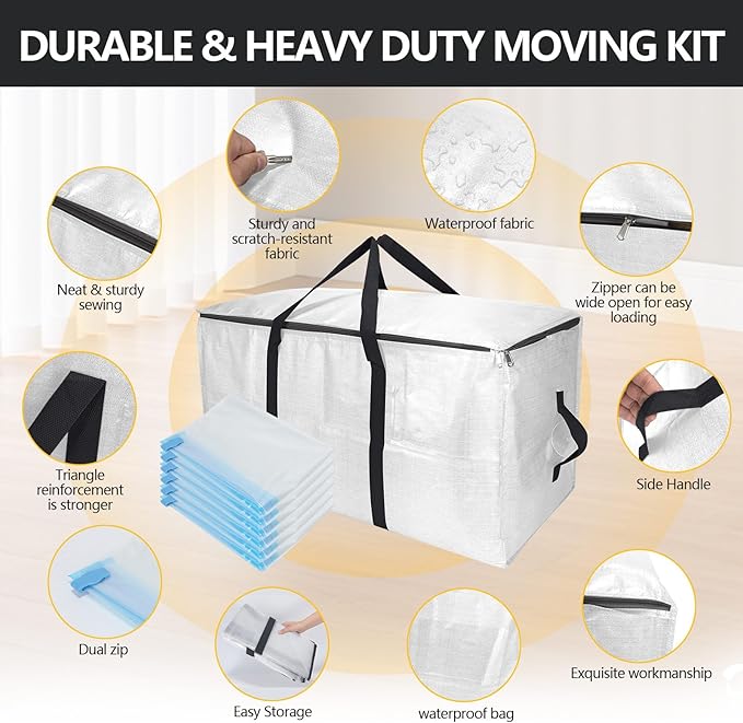 Extra Large Storage Bags Set Heavy Duty Moving Totes with Handles, Waterproof Dual-Way Carrying Design & Vacuum Space Bag (Transparent, 14 Park-4 Moving bag & 10 Vacuum Seal Bags)