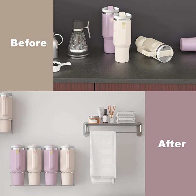- 【WIDE APPLICATION】:Stanley cup holder can be installed in various places and on various walls. Such as mounted on kitchen, dining room, living room, pantry, office, classroom, restroom, bedroom walls and closets. Our wall mounted Stanley Cup Racks can be used to organize not only your Stanley Cups, but also thermoses, wine bottles, cooking spice bottles and toiletries.