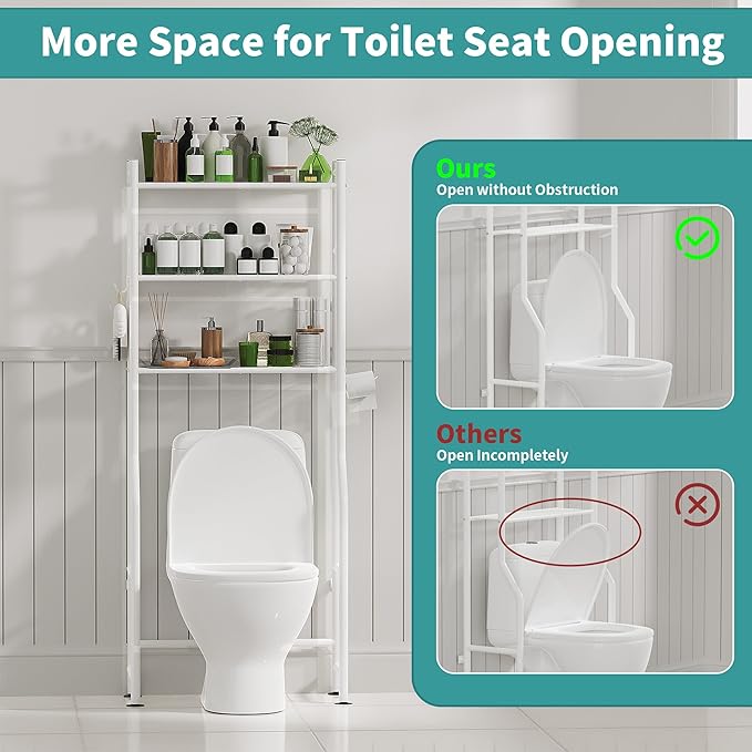 - CONSTRUCTIONAL STABILITY - With 3 open shelves, this above toilet storage rack provides plenty of space to store towels, toilet paper, toiletries and more. The included 4 no-punch anti-tip kits and 4 height-adjustable feet prevent the shelf from swaying and tipping, thus improving the overall stability of the bathroom shelf.