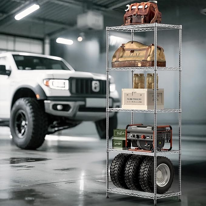 - 【Strong & Durable with 1250 lbs Capacity】 Built with chrome-plated carbon steel and reinforced posts, this 5-tier wire rack holds up to 1000 lbs. Ideal for storing kitchen appliances, heavy tools, or pantry bins.