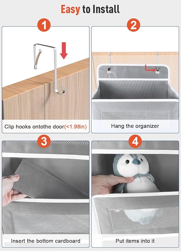- 【Easy to Assemble】Set up the toy storage organizer in a mere 30 seconds. Simply hang the hook on the door, hang the organizer onto the hooks, and insert the 5 bottom cardboards. With special metal hooks designed to fit doors up to 1.98" thick, enjoy a hassle-free and versatile installation experience.