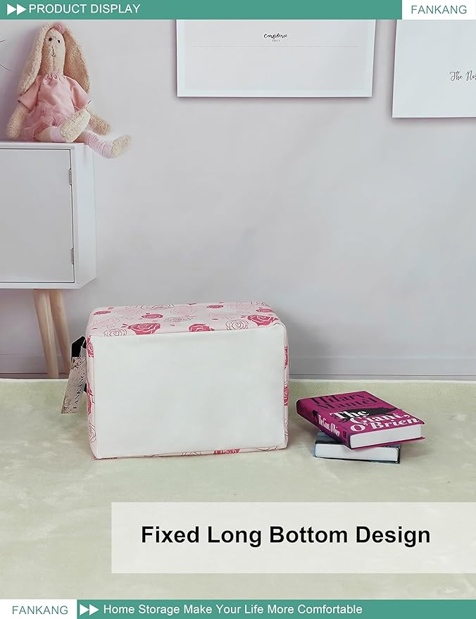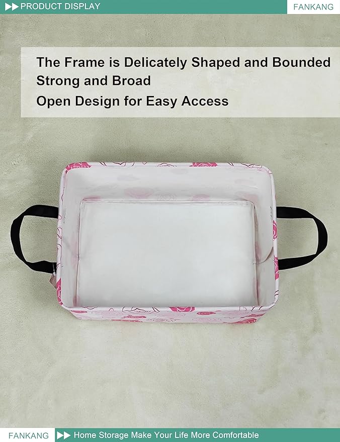 FANKANG Storage Bins, Nursery Hamper Canvas Laundry Basket Foldable with Waterproof PE Coating Large Storage Baskets for Kids Boys and Girls, Office, Bedroom, Clothes,Toys(Rec-Pink roses )