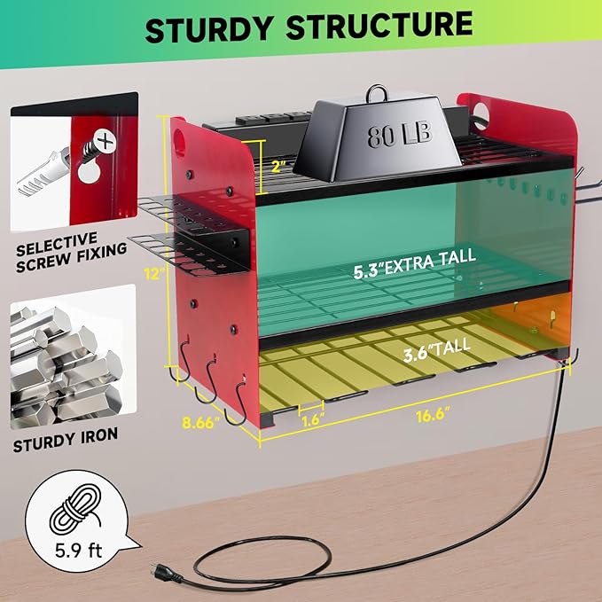 - 3-Layer Efficient Tool Storage: 1-Layer for charging tool organization, 2-layer with extra 4.9" height for garage tools, tool box, bottom 3-layer for 4 cordless drills, side pegboards include drill bit rack, 4 long hooks and 6 S hooks for accessories