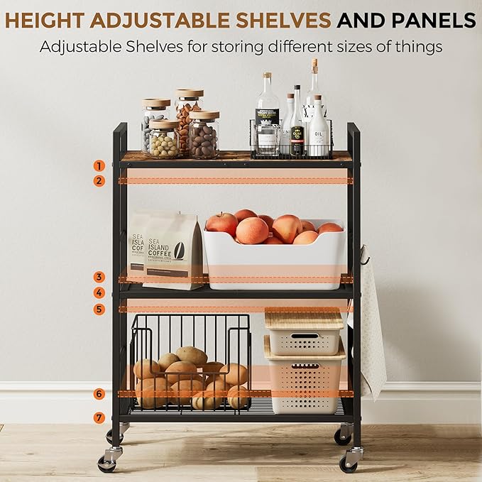 - 【Height Adjustable Shelves And Panels】This storage cart is very flexible in space, and each of its storage layers can be adjusted in height. You can adjust different mounting holes to accommodate items of different sizes according to your needs; If you buy multiple, you can even install them in series with each other for a wider range of storage space;