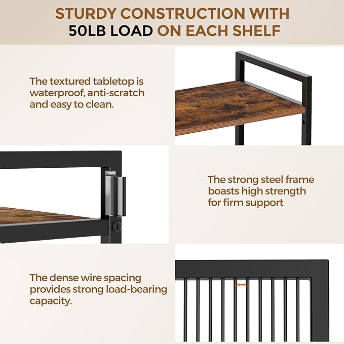 - 【Sturdy Construction With 50lb Load On Each Shelf】XIVIRACK kitchen storage rack organizer are made high quality materials.The textured engineered wood tabletop is waterproof, anti-scratch and easy to clean.The strong steel frame boasts high strength for firm support.The dense wire spacing provides strong load-bearing capacity.