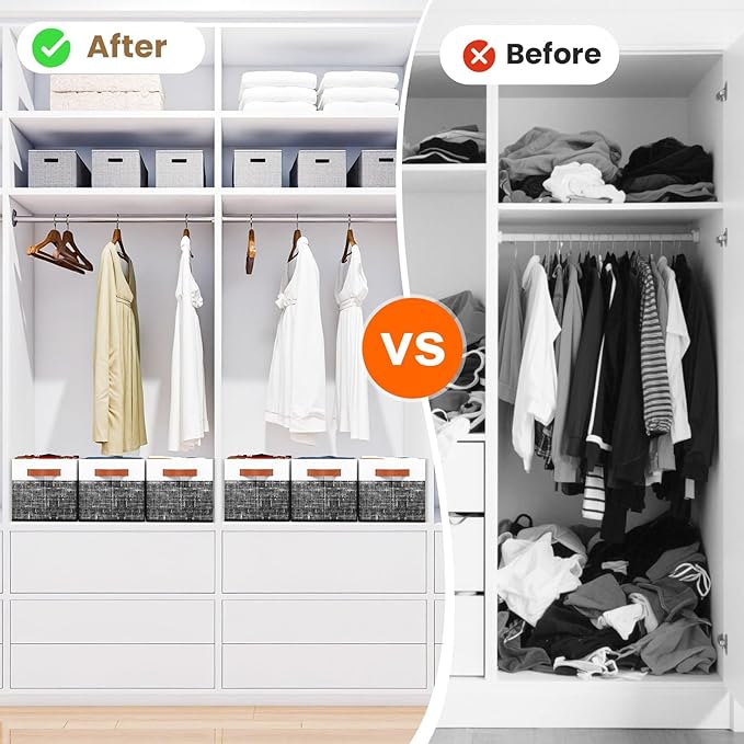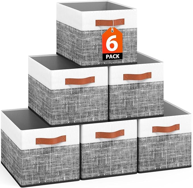 Fab totes Collapsible Storage Baskets for Shelves,14"x10", 6 Pack Foldable Fabric Storage Bins with Double Leather Handles, Large Baskets for Organizing Books, Clothes, White & Black