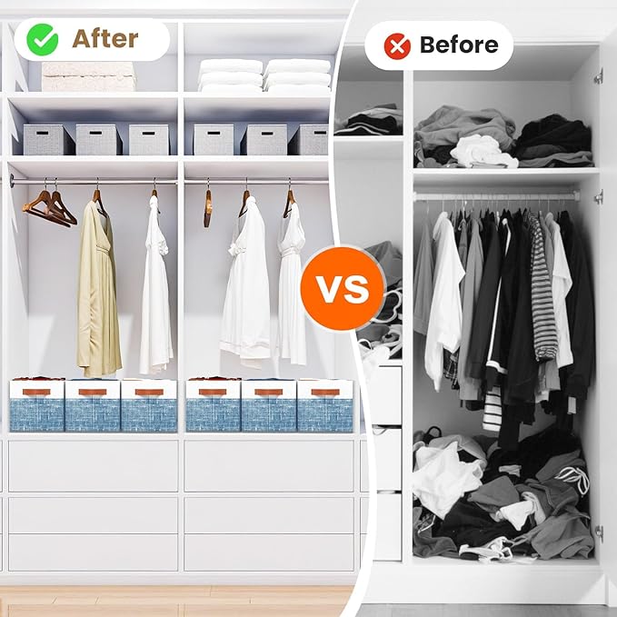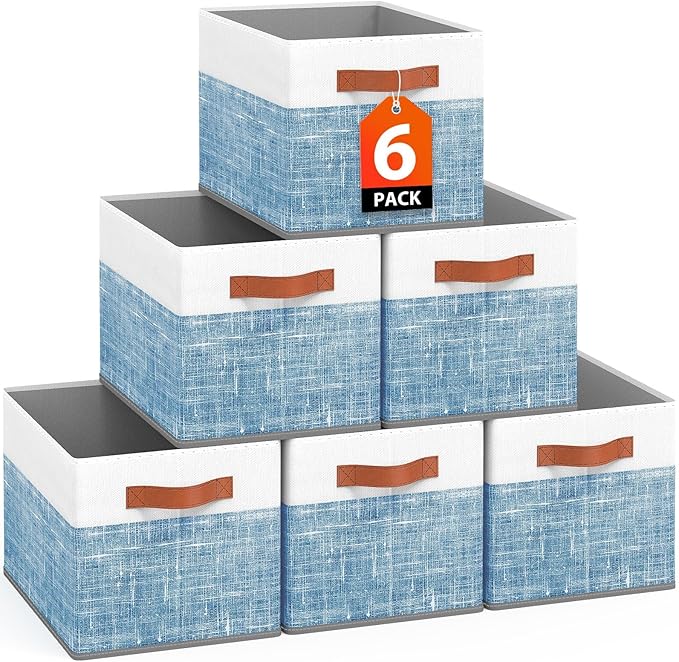 Fab totes Collapsible Storage Baskets for Shelves,14"x10", 6 Pack Foldable Fabric Storage Bins with Double Leather Handles, Large Baskets for Organizing Books, Clothes, White & Blue