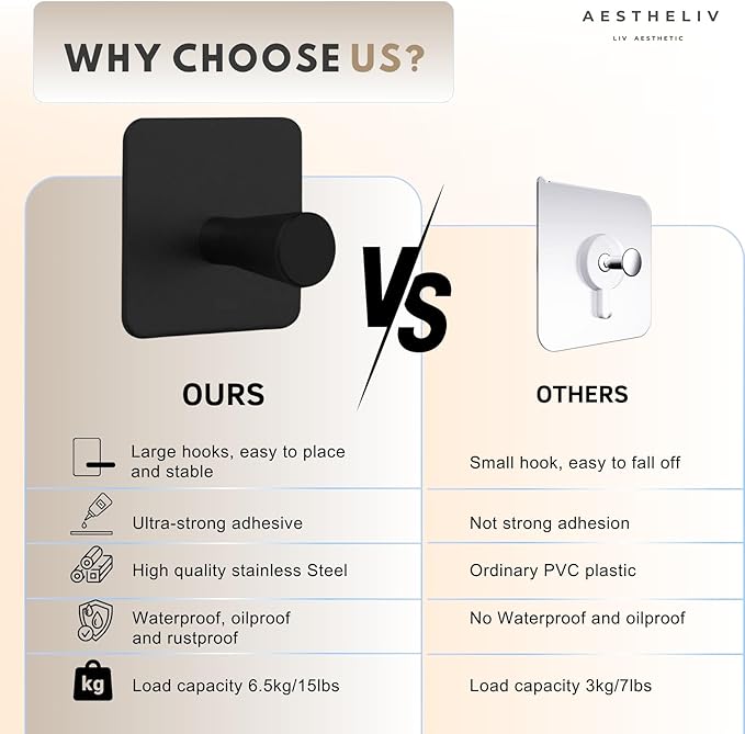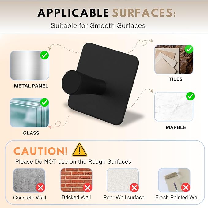 - WATERPROOF AND RUSTRESISTANT – Perfect for Bathrooms and Kitchens : Built to thrive in high-moisture areas, our adhesive wall hooks are waterproof and rust-resistant, making them the ideal solution for organizing your bathroom, laundry room, or kitchen. Unlike metal hooks that rust over time, our premium black finish remains clean and sleek even in steamy or humid environments.