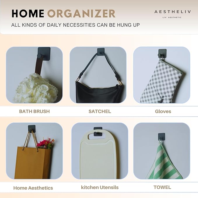 - MULTI-USE WALL HOOKS – Organize Every Corner of Your Home Our 4-pack of black adhesive wall hooks offers endless organization possibilities throughout your home. In the entryway, keep keys, coats, or dog leashes at arm’s reach. In the bedroom, hang accessories, hats, or bags with ease. In the bathroom, they’re perfect for towels, loofahs, and robes. The kitchen? Ideal for utensils, potholders, and cleaning cloths. Even in the garage, laundry room, or office, these hooks add functional storage without taking up space.