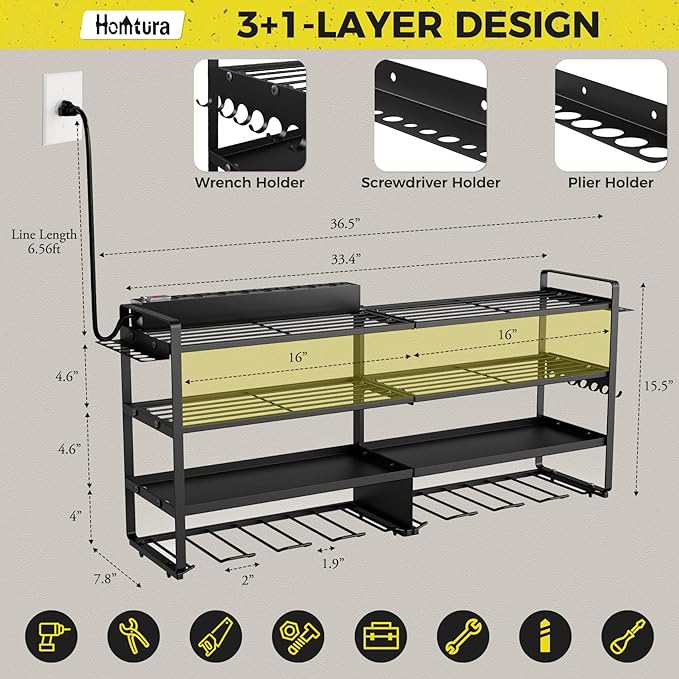 - 8-Outlet Power Strip: Power tool organizer wall mount with a charging station can simultaneously replenish the batteries of different models of power tools, equipped with a 6.5-foot power cord that covers the radius of the regular work area, and does not require frequent movement of the socket position during charging. By combining storage and functionality, this garage organization saves space while ensuring that your power tools are always available for use.