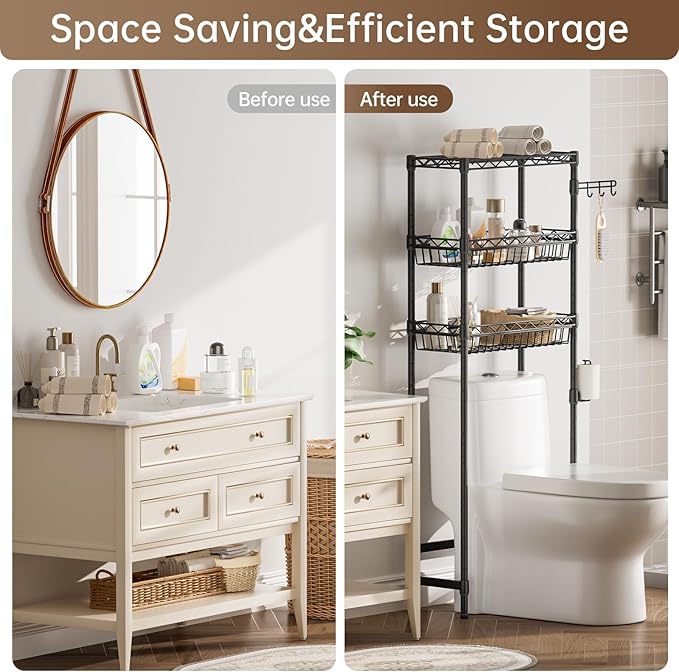 3-Tier Over-The-Toilet Storage Shelf,Heavy-Duty Adjustable Bathroom Rack with 2 Mesh Baskets,Toilet Paper Holder & Hooks,Space-Saving Organizer for Bathroom,10”D x 24”W x 66”H,Black