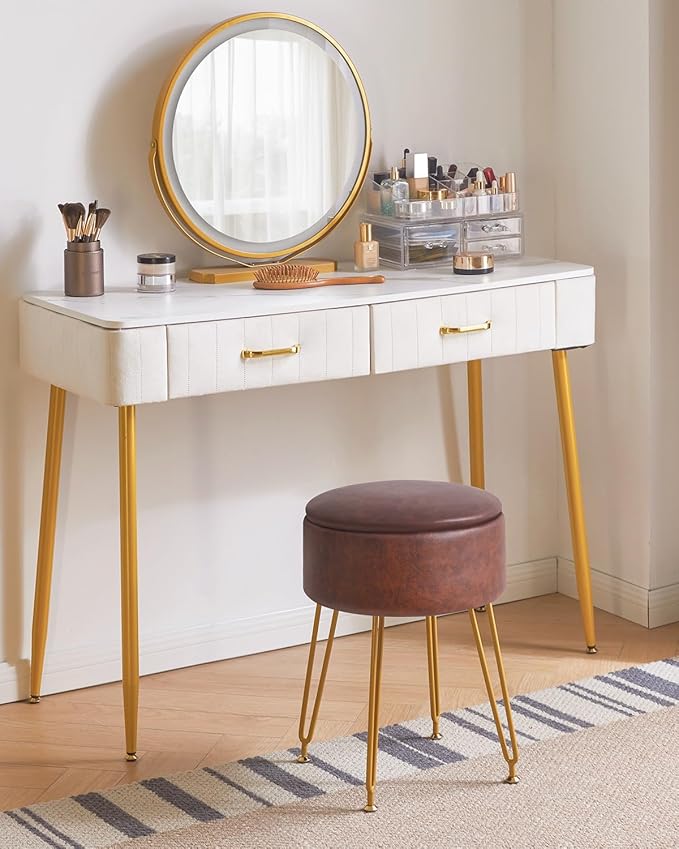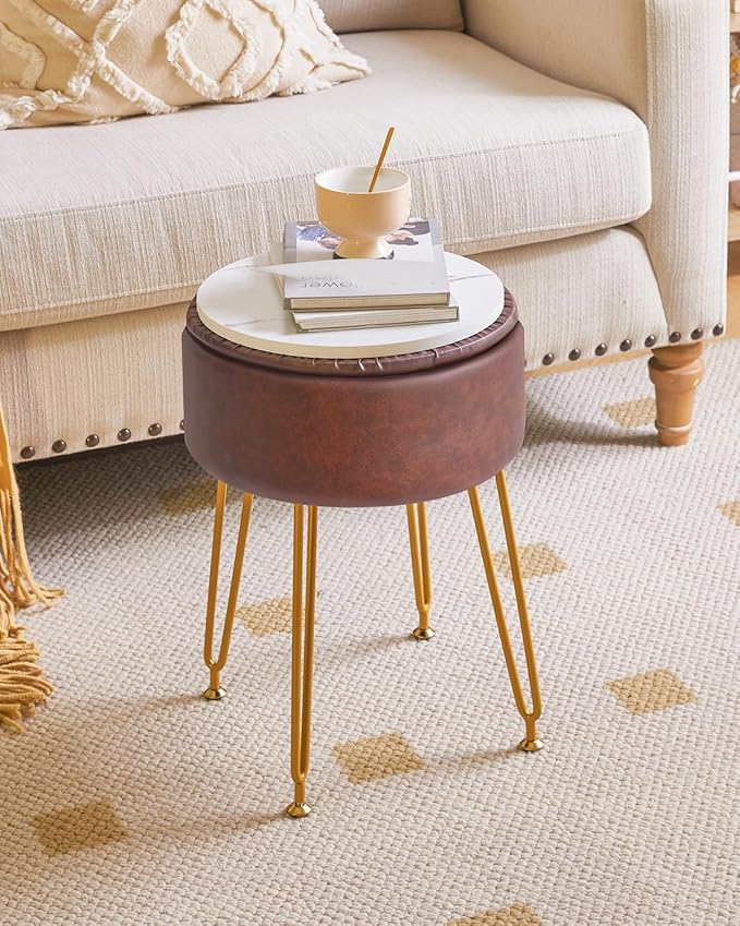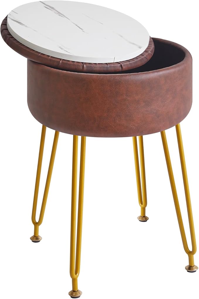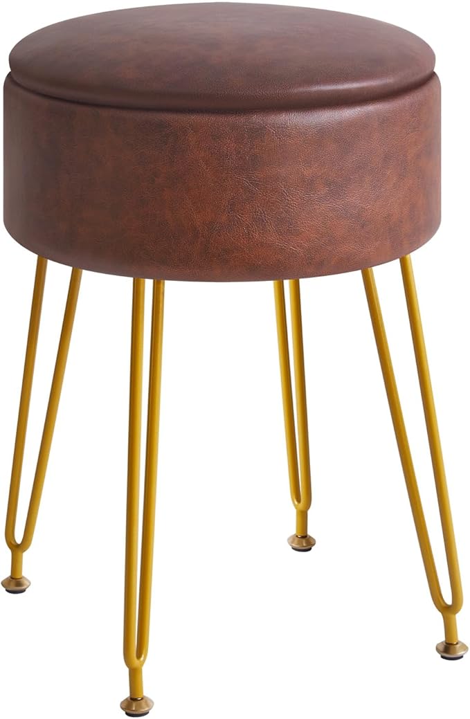 IBUYKE Faux Leather Round Footrest Stool with Storage Ottoman, Makeup Vanity Chair Side Table, PU Dressing Table Seat, Removable Cover, Golden Steel Legs, Dark Brown WBD024Z
