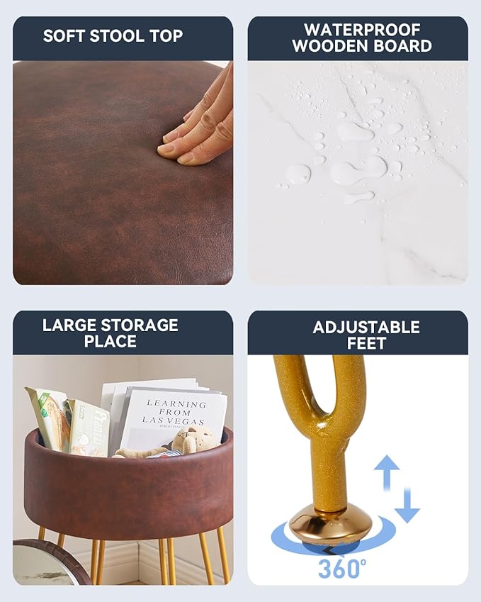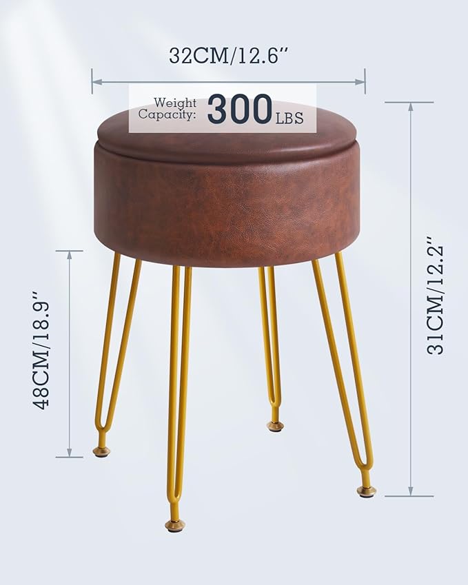 - High quality material: The smooth circular soft seats are wrapped in faux leather and equipped with cushions inside, bringing you ultimate comfort. There is storage space inside the stool. The sturdy base has four metal legs and is decorated with a black powder coating for stability and aesthetics. This stool will be the ideal choice for you at home.