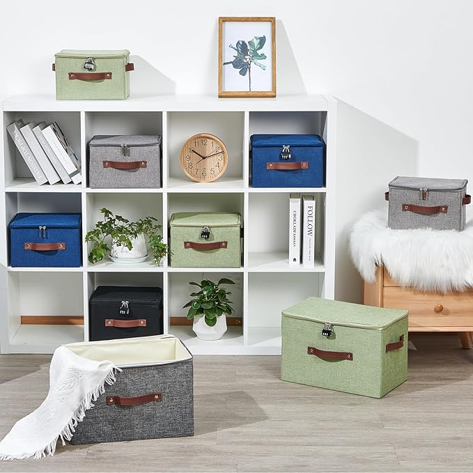 2PCS Storage Bins Boxes with Zipper Lid Combination Lock PU Leather Handles Cotton Linen Fabric Lidded Lockable Baskets Foldable Washable Closet Shelf Organizer Container (Gray, Large)