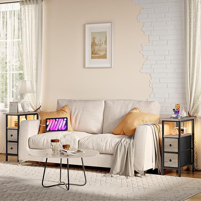 HOOBRO Narrow Side Table with LED Light and USB C Port, Night Stand with Charging Station, Skinny End Table with 2 Fabric Drawers, for Bedroom, Living Room, Greige and Black BG487UDBZ01