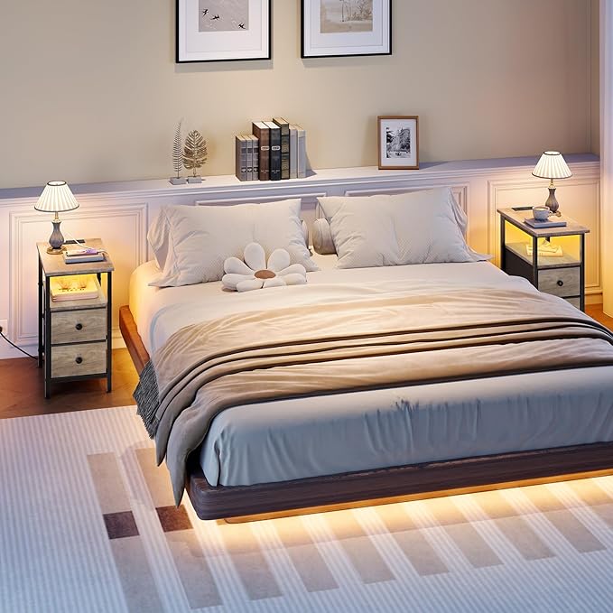 HOOBRO Narrow Side Table with LED Light and USB C Port, Night Stand with Charging Station, Skinny End Table with 2 Fabric Drawers, for Bedroom, Living Room, Greige and Black BG486UDBZ01