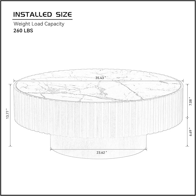 35.43'' Round Coffee Table Wood Circle Coffee Table with Marble Top Pedestal Center Table Fluted Accent Tea Table for Living Room Apartment Office Black