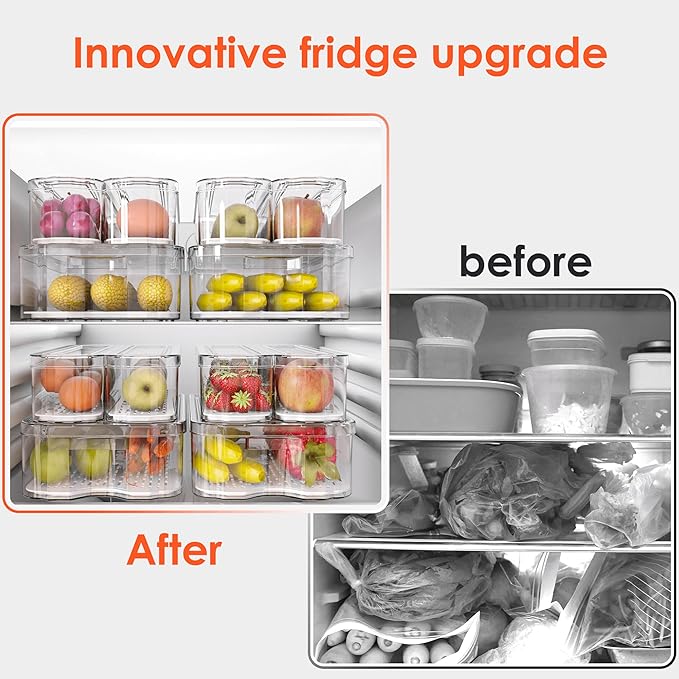 - [Stackable Fridge Organizer] Refrigerator organizer bins with lids help save space and keep your fridge organized, storing food, fruits, vegetables, and more. Perfect for fridges, freezers, cupboards & drawers