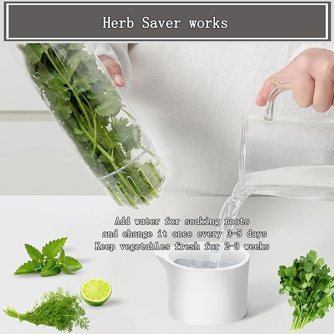 - New Increased Capacity Design : New design of fresh herb keeper, transparent window allows you to see what's inside, tall shape ensures that the vegetables are fresh and will not be deformed, The Herb Saver keeps herbs fresh for up to three weeks, depending on the herb for best results, remember to replace the water with fresh every 3-5 days