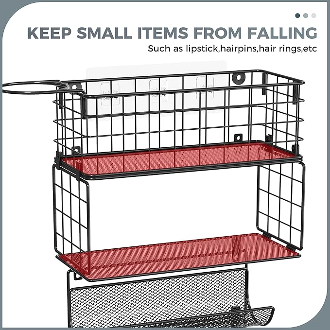 - ⚙️【6-in-1 design storage】The hair tool organizer is composed of 3 diamond-shaped nets, 2 basket,1 iron ring and hooks. It can separate all your hair care tools, such as hair spray, curling irons, razors, etc., and can also store your cosmetics in the basket, such as foundation liquid, lipstick, etc.