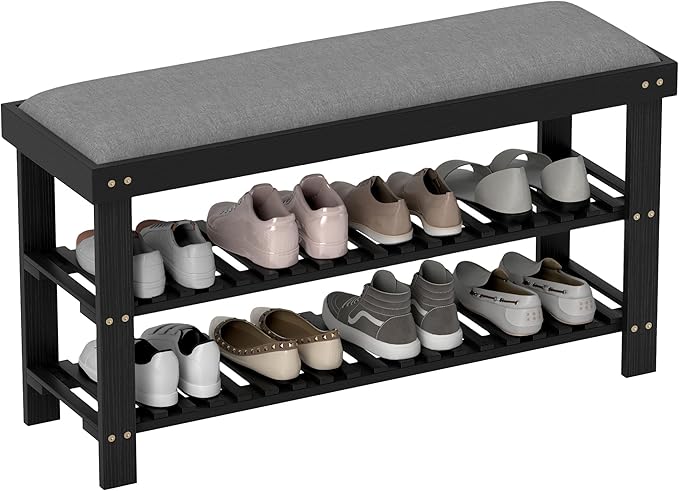 HOMCOM Bamboo Shoe Bench, 3-Tier Entryway Bench with Storage and Cushion, Shoe Organizer for Entryway, Hallway, Holds Up to 331 lbs, 35.4 x 11.4 x 19.3 Inches, Black