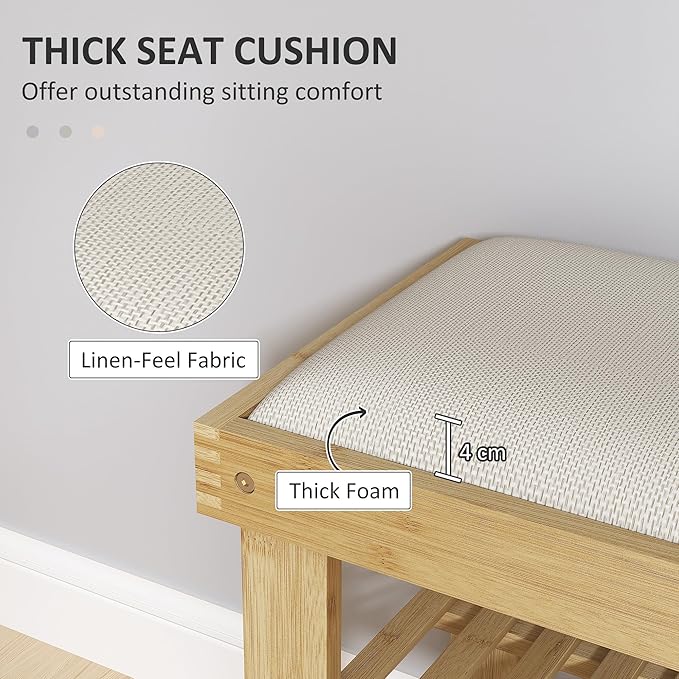 HOMCOM Bamboo Shoe Bench, 3-Tier Entryway Bench with Storage and Cushion, Shoe Organizer for Entryway, Hallway, Holds Up to 331 lbs, 23.6 x 11.4 x 19.3 Inches, Cream White