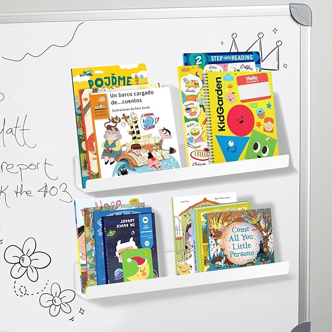 2 Pack Magnetic Book Shelf - Acrylic Reusable Display Panel for Whiteboards, Classrooms & Home, Adhesive-Free Storage with 11lb Capacity (White)