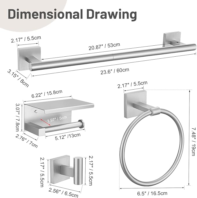 - 5 Pieces Set Combo: 23.6-inch towel bar, towel ring, toilet paper holder with shelf and 2× towel hooks, the towel bar set combo matches perfectly and won't let any product go unused.