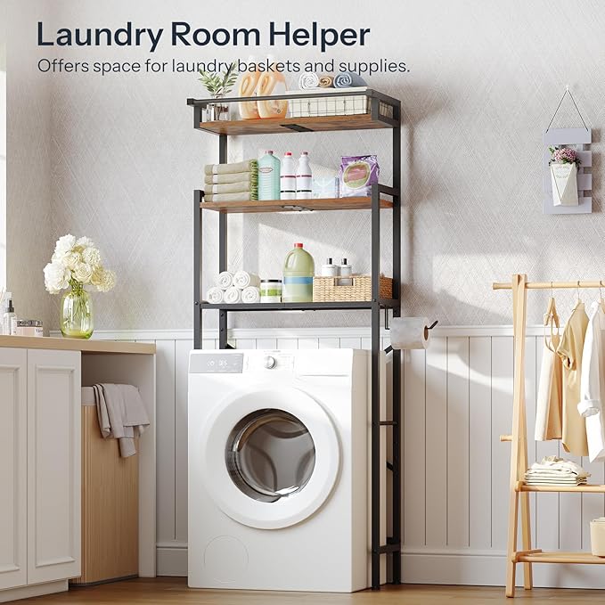 HOOBRO Over-The-Toilet Storage Rack, 3-Tier Bathroom Shelves Above Toilet, Bathroom Organizer with Toilet Paper Hook, Laundry Room, Space Saver, Rustic Brown and Black BF21TS01