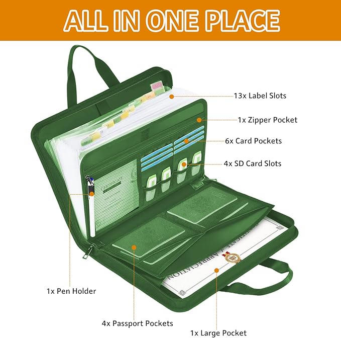 - Enough Space: 14.1 “x11.4 ‘x2’. Our folio document organizer has 1 zippered pockets, 1 pen slots, 4 SD card slots, 13 label pockets(Fit Letter or A4), 6 card pockets, 4 medium mesh pockets and 1 main large pocket