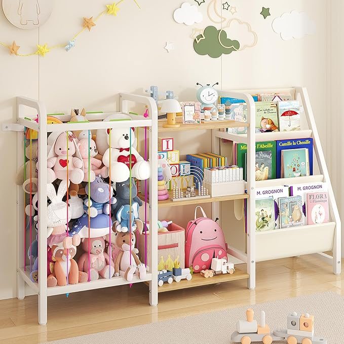 - 3-in-1 Design: This bookshelf for kids combines a stuffed animal organizer, 3-tier wooden toy shelf, and 3-tier Oxford sling pocket into one versatile unit. It offers ample space to store books and neatly organize toys, keeping the room tidy and clutter-free