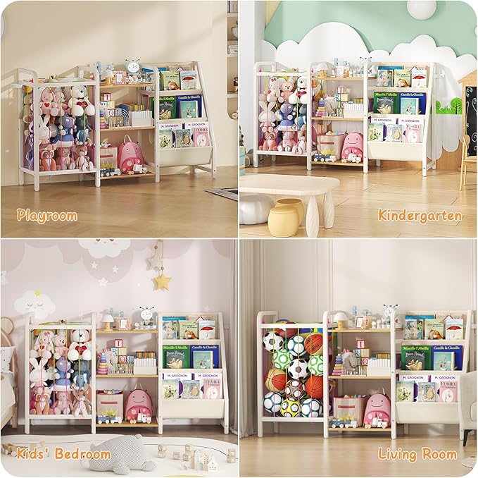 - Spacious & Space-Saving Design: This kids' bookshelf and toy organizer is thoughtfully designed to provide ample space for your child's treasured books and toys, keeping their area tidy by organizing books, blocks, stuffed animals, model cars, dolls, balls, souvenirs, art supplies, and schoolbags