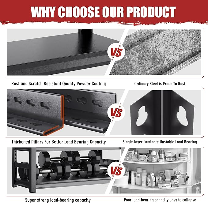 - 【Extremely Sturdy & Durable Garage Shelving】Constructed from high-strength premium cold-rolled steel with advanced powder-coated technology, this metal shelving unit resists rust, oxidation, and wear. The industrial-grade coating not only enhances aesthetics but also boosts durability, making it a heavy duty garage shelving solution for long-term use