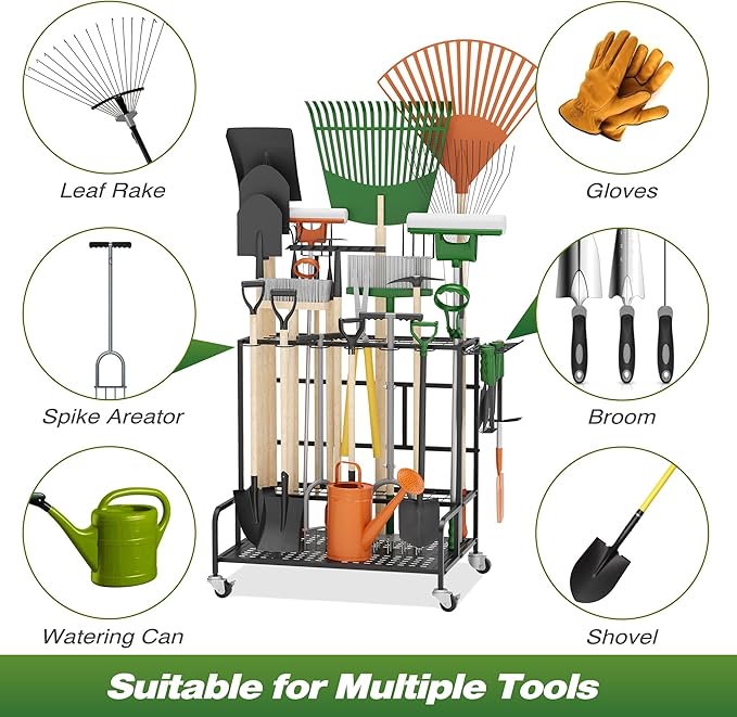- Easy to Move and Assemble:Four lockable wheels for easy mobility,move the rack effortlessly and fix it in place when needed during use. Easily reposition for cleaning or reorganization. Beyond being easy to move, this garden tool stand prides itself on an uncomplicated assembly process. Accompanied by screws and wrenches, setting it up is a breeze. The provided instruction manual offers clear, step-by-step guidance, enabling you to put it together within minutes without breaking a sweat.
