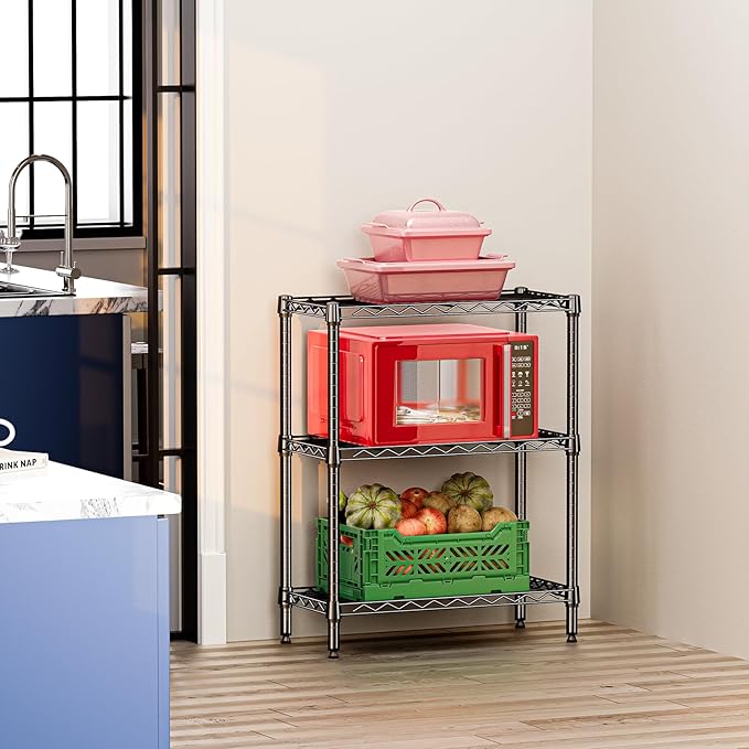 - 【Strong & Stable】Crafted from premium carbon steel, this 3 tier wire shelf offers outstanding strength and durability. With a total load capacity of 750 lbs, it functions perfectly as a pantry floor organizer, bakers rack, or kitchen storage shelf for tools, cookware, and daily essentials.
