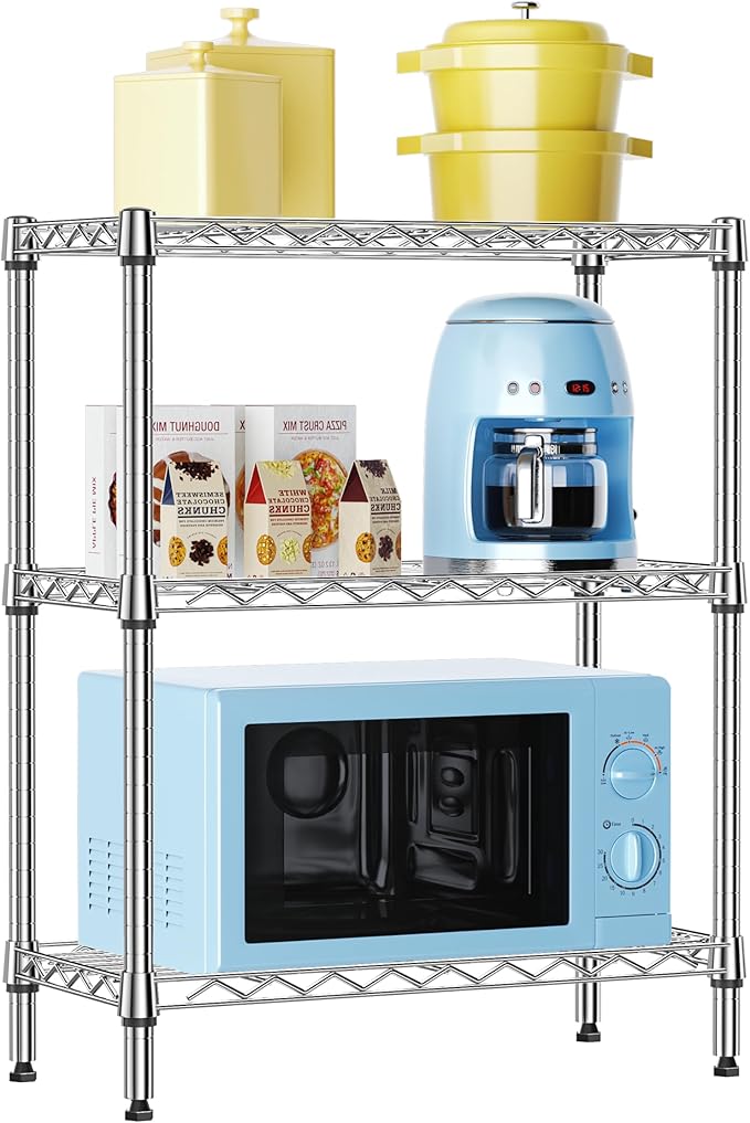 - 【Strong & Stable】Crafted from premium carbon steel, this 3 tier wire shelf offers outstanding strength and durability. With a total load capacity of 750 lbs, it functions perfectly as a pantry floor organizer, bakers rack, or kitchen storage shelf for tools, cookware, and daily essentials.