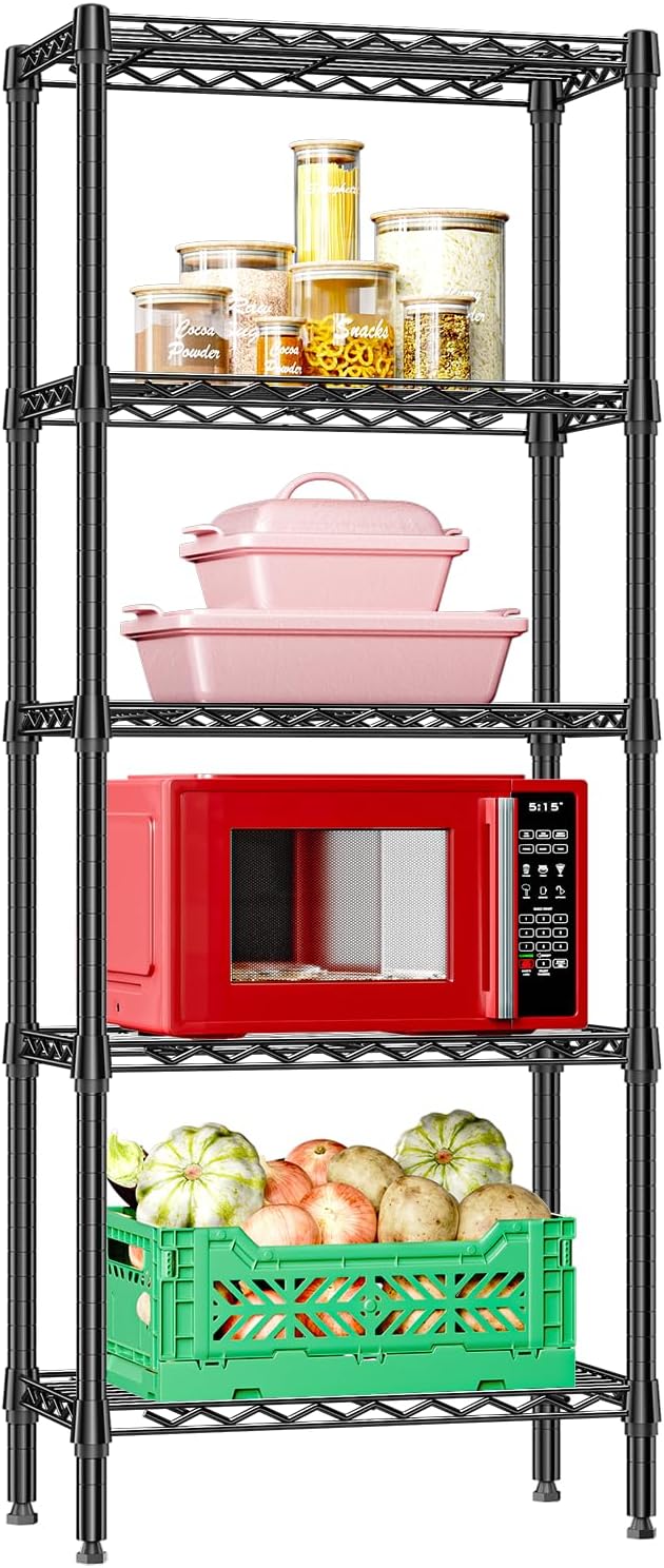 - 【Strong & Stable】Built with premium carbon steel, this 5-tier shelves organizer offers excellent strength and durability. With a total load capacity of 1250 lbs, it’s ideal as a pantry rack, bakers rack, or kitchen rack for storing tools, cookware, and everyday essentials.