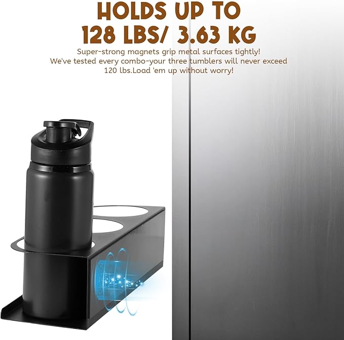 - Engineered for 30-40oz tumblers, this rugged organizer features industrial-grade neodymium magnets (8,000 Gauss total) that lock securely to fridge doors or metal surfaces, even through condensation. Perfect for gym rats, remote workers, and busy families, its one-handed magnetic alignment lets you grab-and-go instantly.