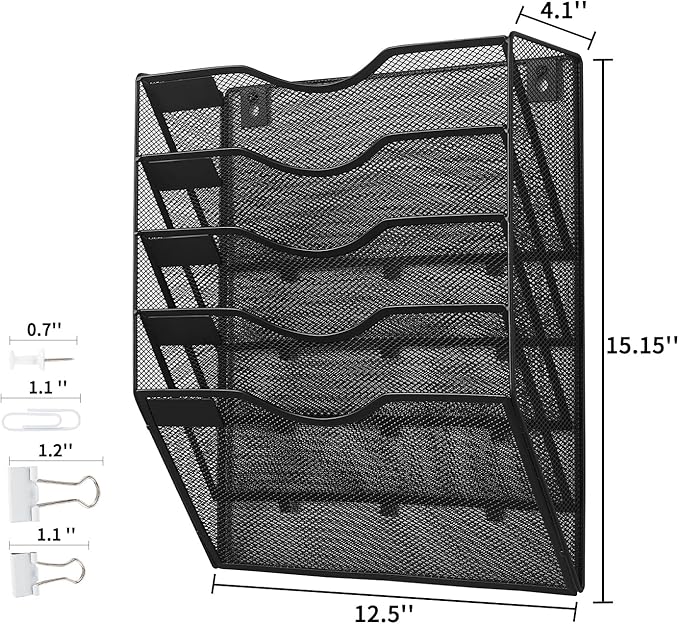 - {Office Supplies Assorted} This wall file organizer comes with M-size binder clips*7, S-size binder clips*13, paper clips*26 and push pins*21, perfect and necessary office accessories assorted for your desk organization and storage. You can keep your files and papers always well organized