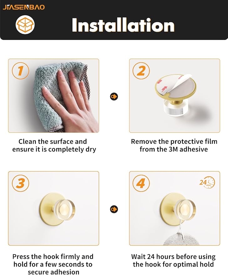 - No Drill : Install the hook with a 3M self-adhesive strip (Cuation: only suitable for smooth surface such as tile, marble, glass, wooden wall etc.) ideal for hanging towel, coat, robe, hat, bag, backpack