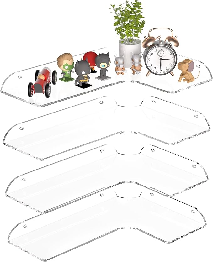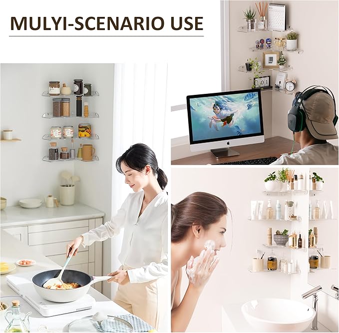 - Space Saver: The acrylic corner wall shelf is a perfect space saver in your house. Wall mounting design will help you to organize your toiletries, figures, books, cosmetics, skincare, perfume or spice jars very well. You will get more space in your house. Say goodbye to mess!